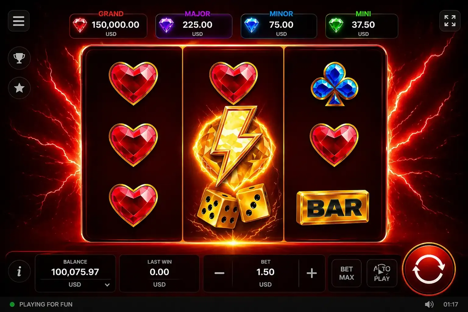 Diamonds Power O’yna tugmasini bossangiz, o’yin darhol yuklanadi va siz tikka qo’yishni boshlashingiz mumkin. Avval tikka miqdorini tanlaysiz, keyin barabanlarni aylantirish tugmasini bosasiz. O’yin jarayoni tez va qulay tarzda amalga oshiriladi.